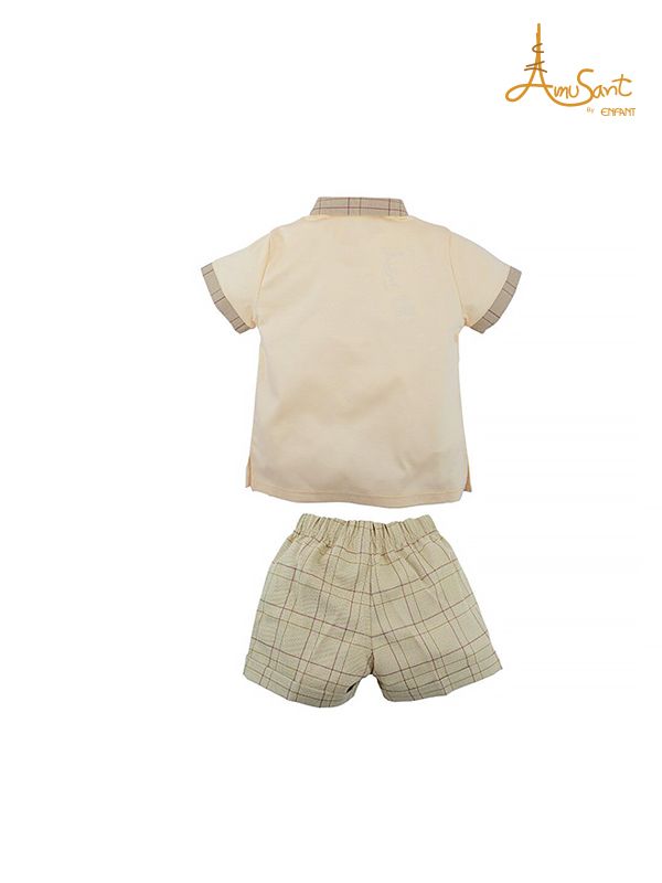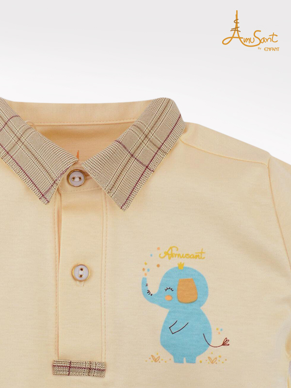 Amusant baby Boy clothing set 100% Fine Mercerized Cotton and Woven Fabric. Top Polo Shirt, Knitted Fabric (interlock) printed with cute elephants. Decorate the collar and cuffs with chic plaid woven fabric. Comfortable to wear, non-irritate to the skin. Bermuda shorts. Chic Plaid Soft Woven Fabric with Elastic waist all around and 2 pockets. |