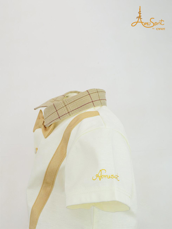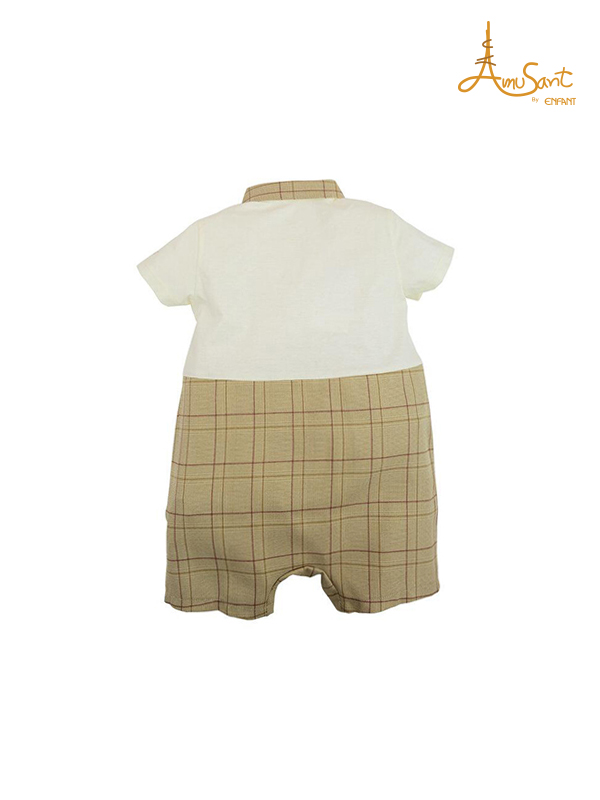Amusant Brand Baby Body Suit, 100% Fine Mercerized Cotton(Woven and Knitted Fabric) Super Fine Fabric. Baby Boy Body Suite Luxury Style, with Shirt (knitted Fabric) Cream, decorated with plaid woven fabric cover. Suspenders and satin Bow tie decorated. Front 3 gold button opening shirt. Bermuda shorts, plaid woven fabric, with 4 snaps button for opening crotch. for easy wearing. with Soft woven fabric. |